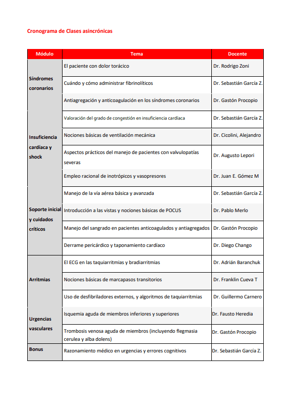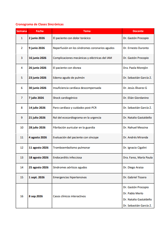 Resolución práctica de problemas: Cada clase estará orientada a brindar herramientas concretas para el abordaje de problemas frecuentes y escenarios desafiantes en la urgencia cardiovascular, con foco en la toma de decisionesinicial y en el manejo durante las horas críticas iniciales en servicios de emergencia.